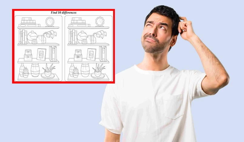 Czy dałeś radę znaleźć wszystkie szczegóły? Czy zmieściłeś się w czasie? Jeżeli nie udało ci się dostrzec wszystkich detali, podajemy krótką podpowiedź. Przyjrzyj się bliżej następującym elementom obrazków: duża i średnia książka na najwyższej półce, rama lusterka, wazon z rośliną (druga półka od góry), duża skrzynka, obramowane zdjęcie, książki na drugiej półce od dołu, roślina w doniczce, duży wazon na pierwszej półce od dołu. Czy masz już komplet różniących się detali?